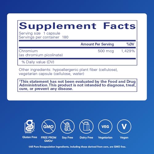 Pure Encapsulations Chromium (Picolinate) 500 mcg – for Lipid & Carbohydrate Metabolism* – Mineral Supplement – Superior Absorption Chromium Supplement – Vegan & Gluten Free – 180 Capsules