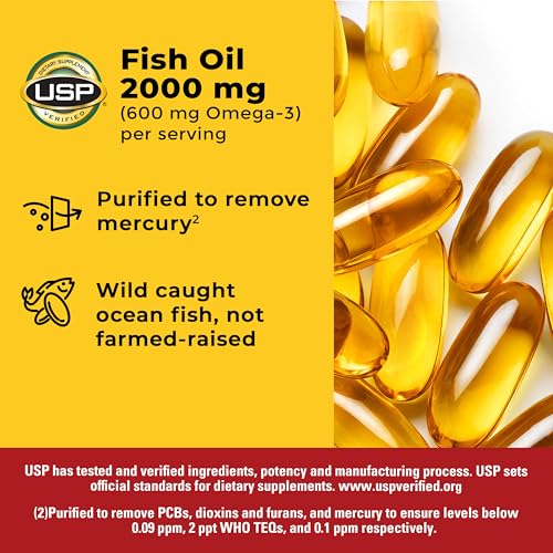Nature Made Fish Oil 2000 mg is a dietary supplement that provides 300 mg Omega-3 fatty acids per softgel to help support a healthy heart. A serving of two Nature Made Fish Oil Omega 3 softgels provides 2000 mg Fish Oil with 600 mg Omega 3s (500 mg EPA and DHA). Sourced from high-quality ingredients, these gluten free Nature Made Fish Oil 2000mg Omega-3 supplements have no color added, no artificial flavors, and are purified to remove mercury(2) from wild-caught ocean fish, not farm-raised fish. Adults, take two Omega 3 Fish Oil supplements daily with water and a meal. For those who don’t consume fish regularly, an Omega 3 supplement like fish oil Nature Made can help provide Omega 3 Fish Oil for men and women. Nature Made DHA EPA Omega 3 supplements are quality you can trust. USP has tested and verified ingredients, potency and manufacturing process. USP sets official standards for dietary supplements. Visit the USP verified website for more information. (2)Purified to remove PCBs, dioxins and furans, and mercury to ensure levels below 0.09 ppm, 2 ppt WHO TEQs, and 0.1 ppm respectively. *Based on a 2024 survey of pharmacists who recommend branded vitamins and supplements.