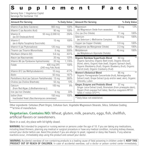 Rainbow Light Women’s One Multivitamin provides comprehensive nutritional support to promote women’s health. This comprehensive high potency multivitamin is designed to nourish, energize, and support a woman’s body with scientifically studied ingredients and a unique Women’s Vitality Blend to fuel female vitality at the cellular level. Each tablet contains key ingredients including potent B-vitamins, choline, antioxidant vitamin C and E, plus vitamin D that promote natural energy production and supports bone, breast, immune and nervous system health. The Women’s Vitality Blend contains organic chlorella, pomegranate, grape extract, and lutein for energy and vitality. Rainbow Light Women’s One Multivitamin provides comprehensive nutrition to support a vibrant healthy lifestyle. These statements have not been evaluated by the Food and Drug Administration. These products are not intended to diagnose, treat, cure prevent any disease.